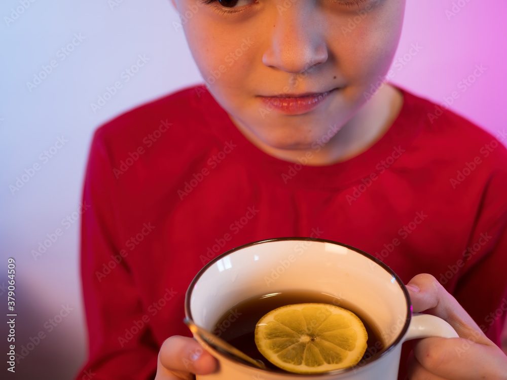 Funny Boy Blond Got Sick And Is At Home In Quarantine Child Drinks Hot Tea From